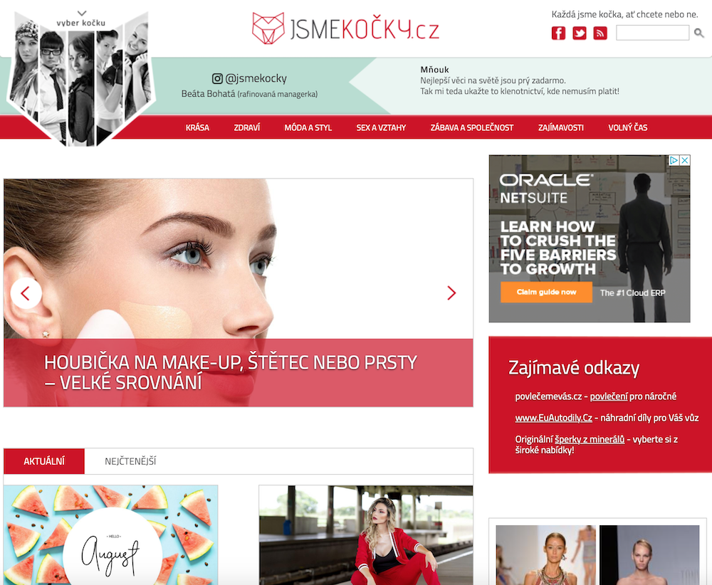 Magazín Jsme kočky se věnuje lifestyle tématům od stravy a receptů přes krásu a zdraví až po vztahy a společnost. Nebojí se humoru, sarkasmu a choulostivých nebo kontroverzních témat.